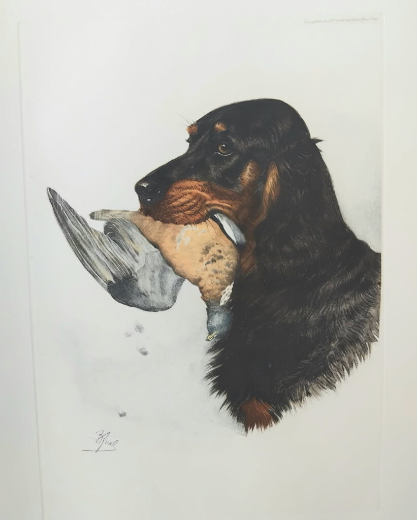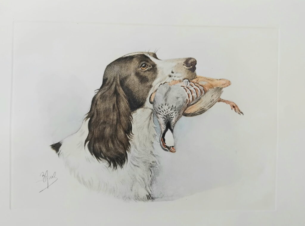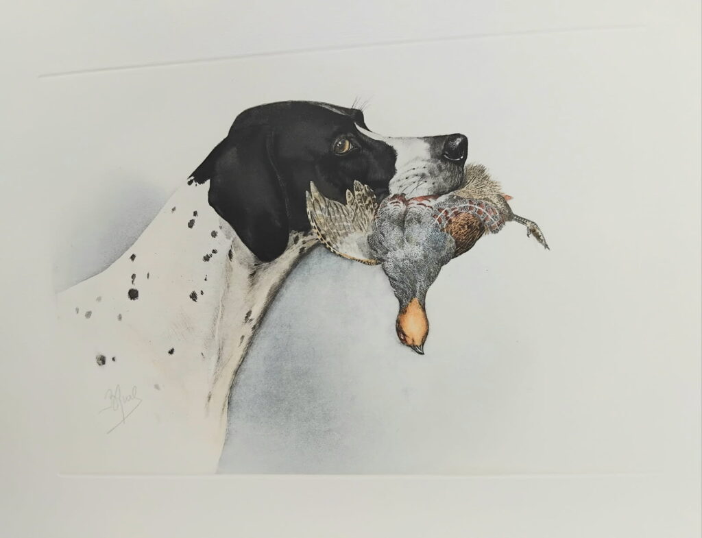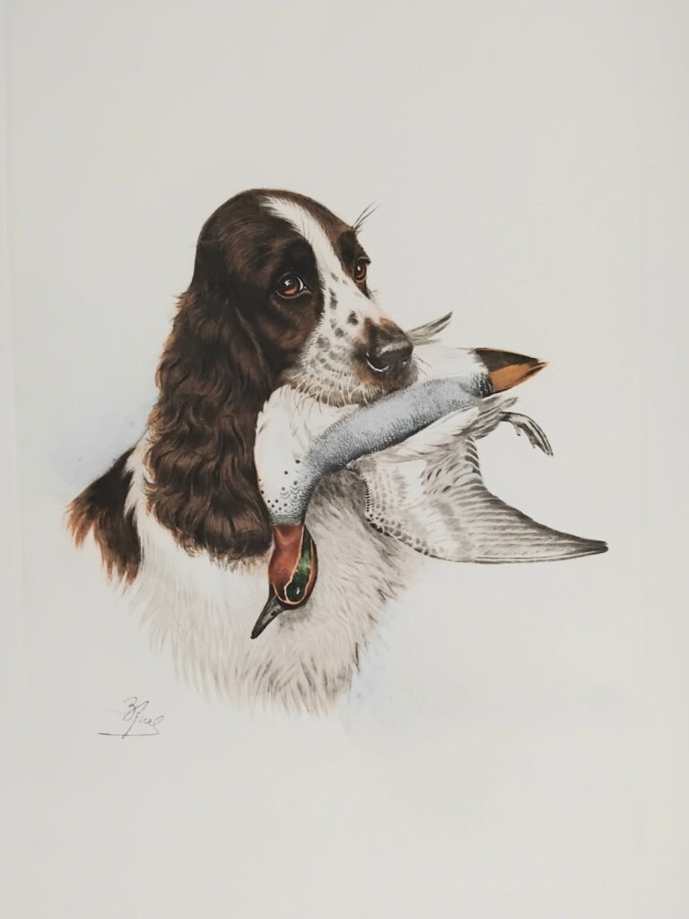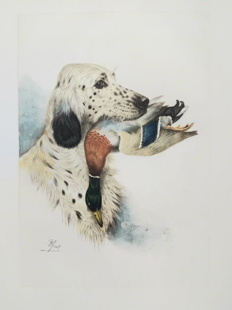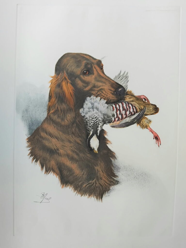 Riab - Gravures La plus part des gravures disponibles aujourd’hui sont non numérotées et la signature est à l’ENCRE bien qu’elle semble imiter le crayon.Il m’arrive de proposer des gravures d’époque signées crayon, et parfois même des aquarelles originales.Toute demande concernant la recherche d’une gravure sera considérée. « Setter Irlandais et perdrix rouge »Gravure signée à l’encre sans numérotationTirée sur papier vélin d’archesDimension au sujet : 34,5 x 50 cmExtérieur des marges : 45 x 62 cm Prix : 130€ « Setter Gordon et pigeon »Gravure signée à l’encre sans numérotationTirée sur papier vélin d’archesDimension au sujet : 34,5 x 50 cmExtérieur des marges : 45 x 62 cm Prix : 130€ « Setter Anglais et canard colvert »Gravure signée à l’encre sans numérotationTirée sur papier vélin d’archesDimension au sujet : 34,5 x 50 cmExtérieur des marges : 45 x 62 cm Prix : 130€ « Spaniel et Sarcelle d’hiver »Gravure signée à l’encre sans numérotationTirée sur papier vélin d’archesDimension au sujet : 34,5 x 50 cmExtérieur des marges : 45 x 62 cm Prix : 130€ « Spaniel et perdrix grise »Gravure signée à l’encre sans numérotationTirée sur papier vélin d’archesDimension au sujet : 27 x 39 cmExtérieur des marges : 41 x 50 cm Prix : 100€ « Pointer et perdrix grise »Gravure signée à l’encre sans numérotationTirée sur papier vélin d’archesDimension au sujet : 27 x 39 cmExtérieur des marges : 41 x 50 cm Prix : 100€